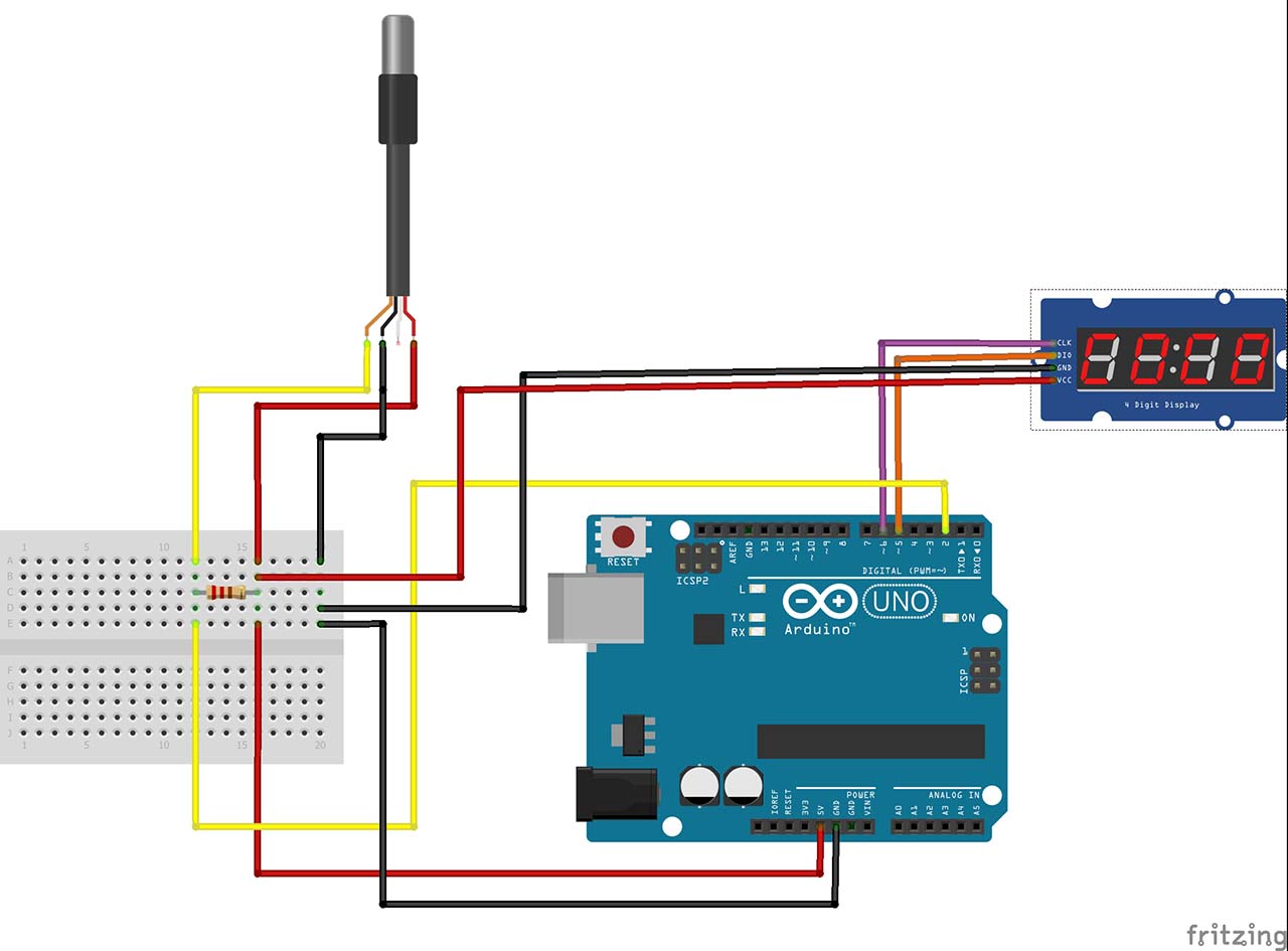 Using shortened dupont connecting wires, the power and ground for the temperature sensor and display were soldered to a single supply wire, and the data line for the sensor was soldered to the power supply via the resistor. The CLK and DIO wires were just shortened. All connections were shrink wrapped to avoid any short circuits. Finally I soldered a short pin to each wire for connecting to the UNO and attached the display using my hot glue gun.