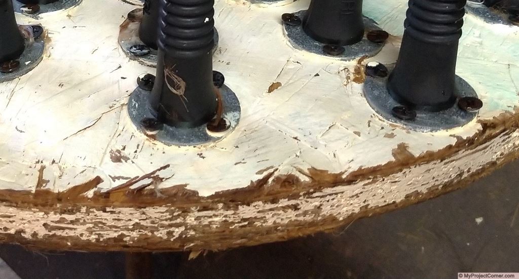 Most of damage has been caused by the issue with the chicken’s leg, which occasionally getting caught between the plate and the drum. This wears the paint off and allows the water to contact with the surface of the wood.