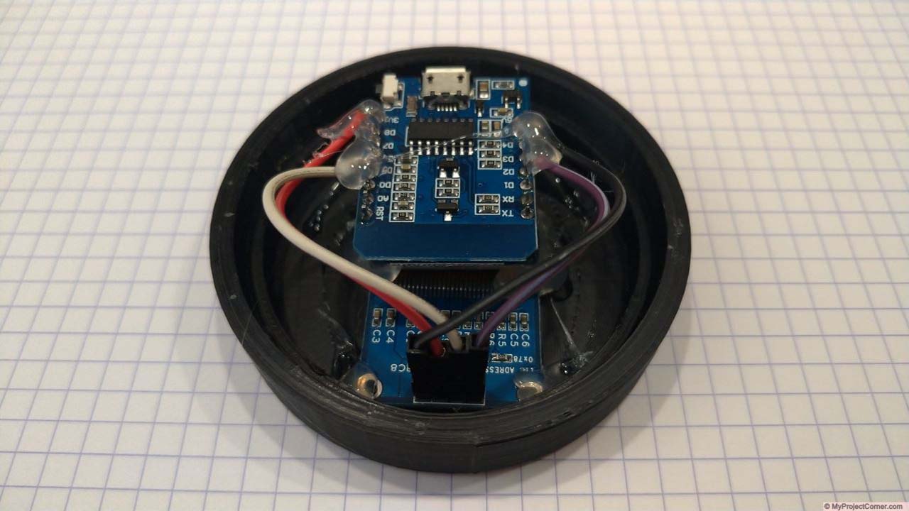 Then insert the D1 mini and DHT22 assembly, be sure to use a blob of hot glue to ensure a gap between the DHT22 shield & the display.