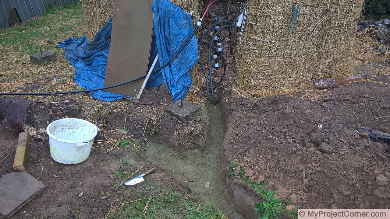 Y enterré las tuberías de suministro y retorno de agua (en un tubo aislado) en el fondo de una zanja, y también hice funcionar la red eléctrica y un cable de cat5 a la pila (para el Raspberry Pi).