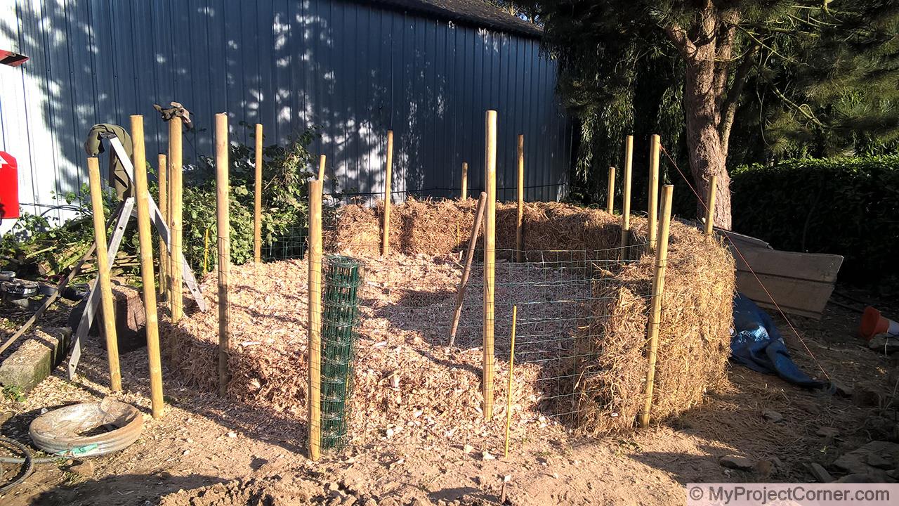 Entonces la valla de jardín más barata que pude encontrar estaba envuelta alrededor de los dos juegos de postes. Después, comenzó a llenar el hueco entre las dos vallas con paja.