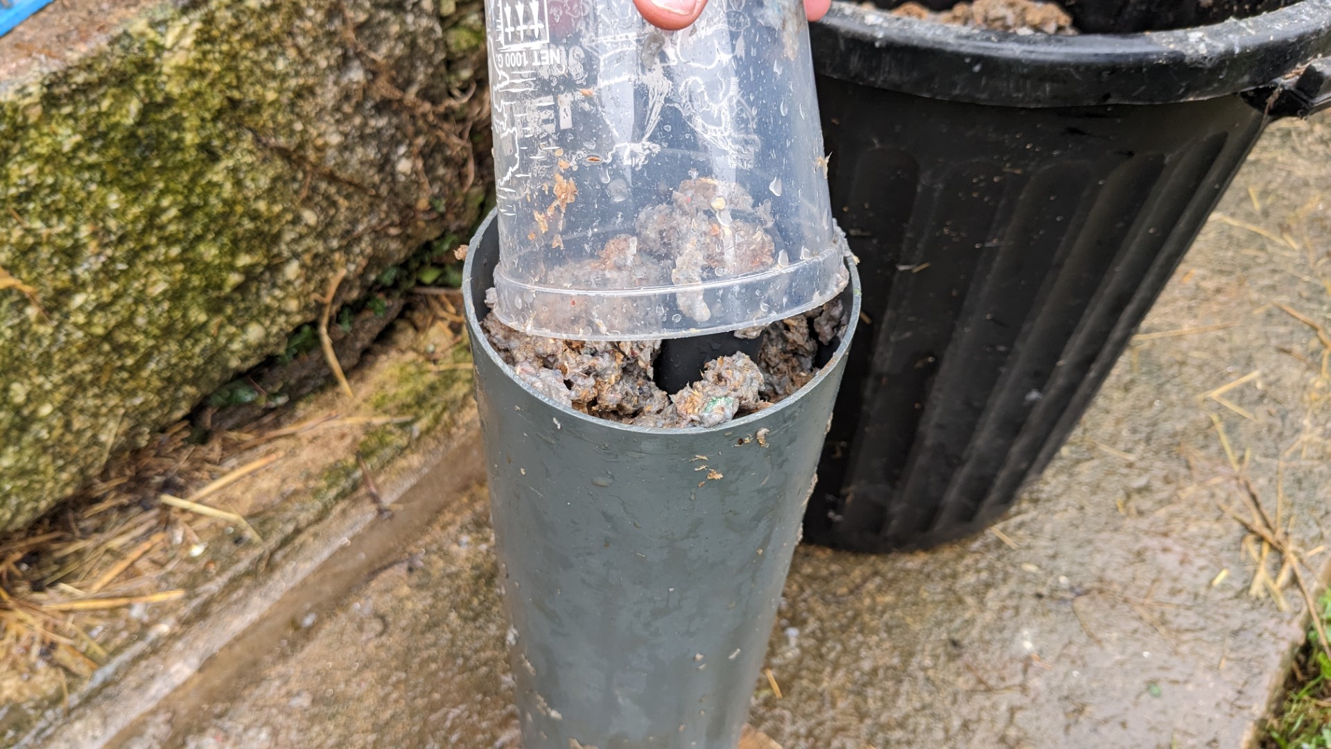 El agujero de 50 mm de diámetro se utiliza para ubicar el tubo de drenaje central de 650 mm de longitud. Este es el tubo de PVC de 50 mm perforado con agujeros de 8 mm (¡muchos!)