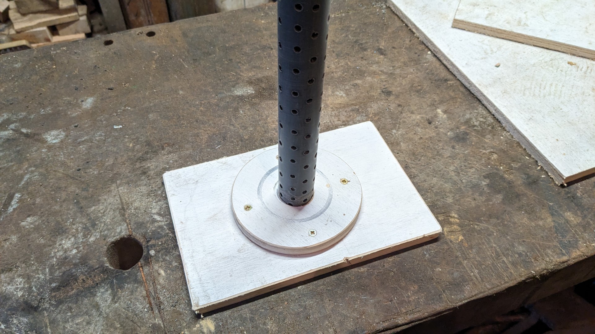 A continuación, utilizando un pequeño recorte del tubo, marque y recorte el disco de ubicación. Atornilla el disco a la placa base con cuatro tornillos y utiliza una sierra de 50mm para perforar el centro del disco de localizacion. Taladre también un orificio de drenaje de 20 a 30 mm en el centro de la placa base.