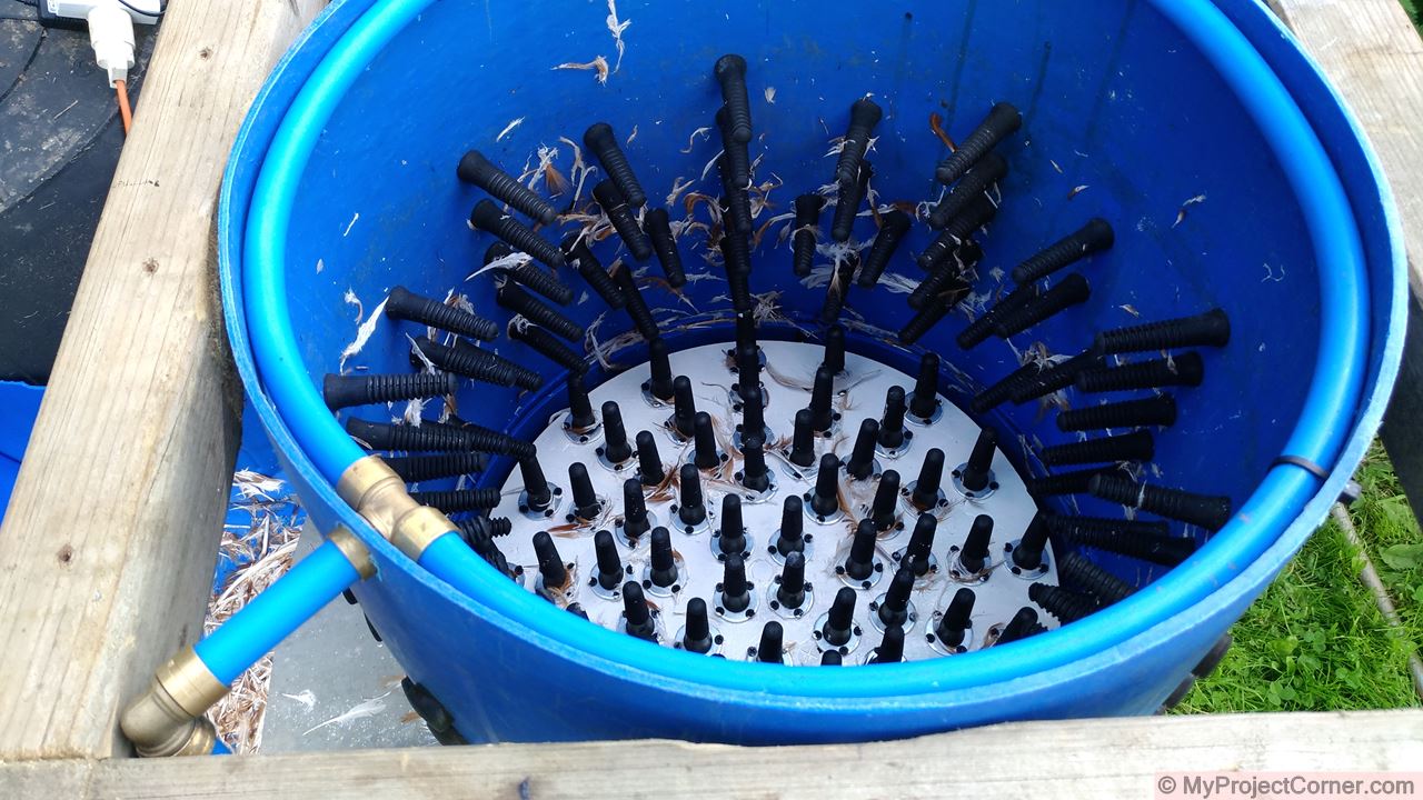Beaucoup de constructions en ligne que j’ai rencontrées utilisaient un tuyau d’arrosage pour enlever les plumes, j’ai donc décidé de choisir un système intégré pour mon plumeuse de poulet fait maison. Il s’agissait d’un tuyau d’eau PER de 20 mm de diamètre formé au diamètre intérieur du haut du tambour, d’un connecteur en “T”, d’un connecteur à 90°, d’un robinet à 1/4 de tour et d’un raccord de tuyau. Une fois le tuyau fixé au fût à l’aide de serre-câbles, j’ai percé des trous de 3 mm, espacés de 5 cm, sur la circonférence intérieure, à un angle d’environ 45°. Grâce à cette installation, je peux ébouillanter un poulet pendant que le plumeuse est en train de plumer, ce qui accélère vraiment le processus lorsque je suis seul.