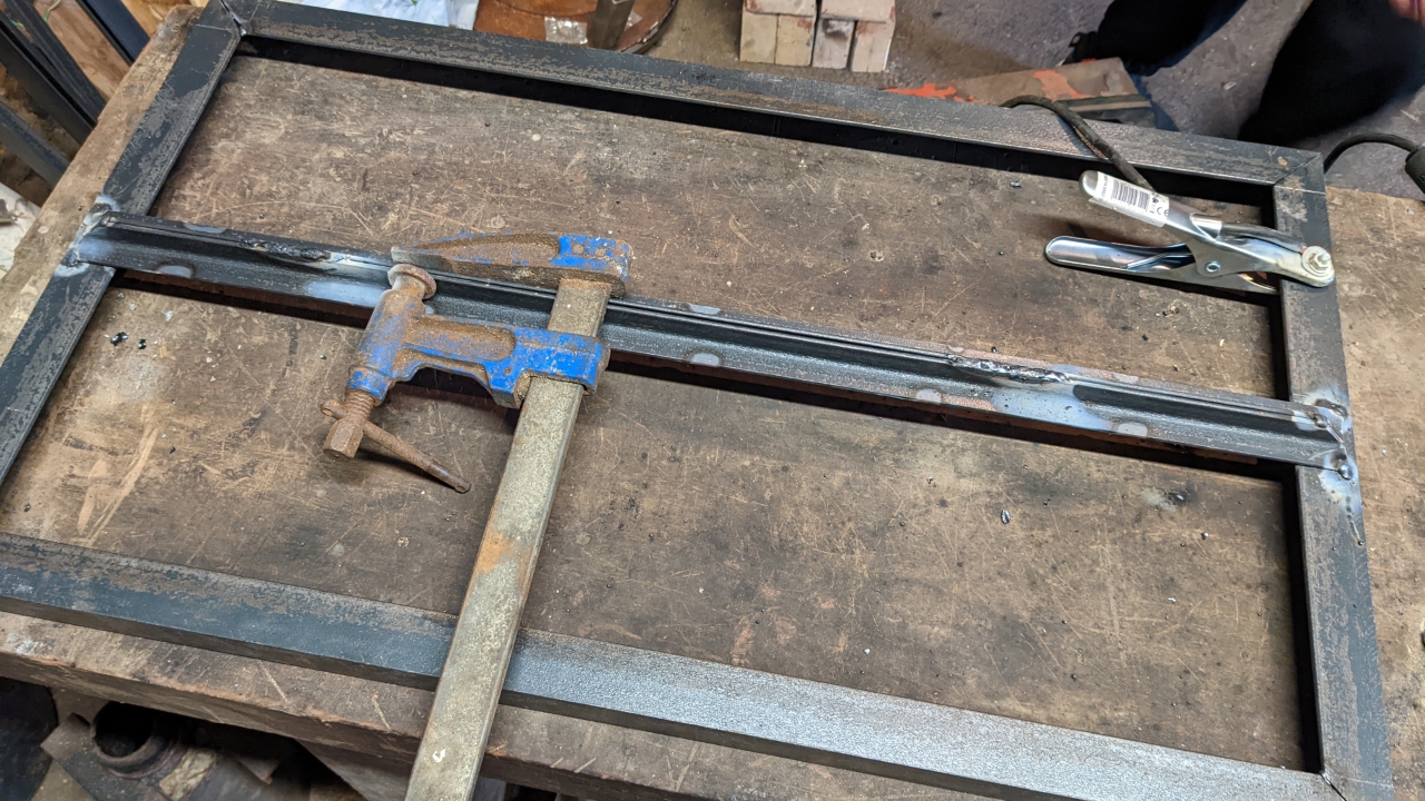 Le cadre rectangulaire est construit à l’aide d’un angle en acier de 35x35x3,5mm, coupé à 45° dans les coins. On ajoute ensuite un support central constitué d’un double angle en acier 20x20x3, dos à dos.