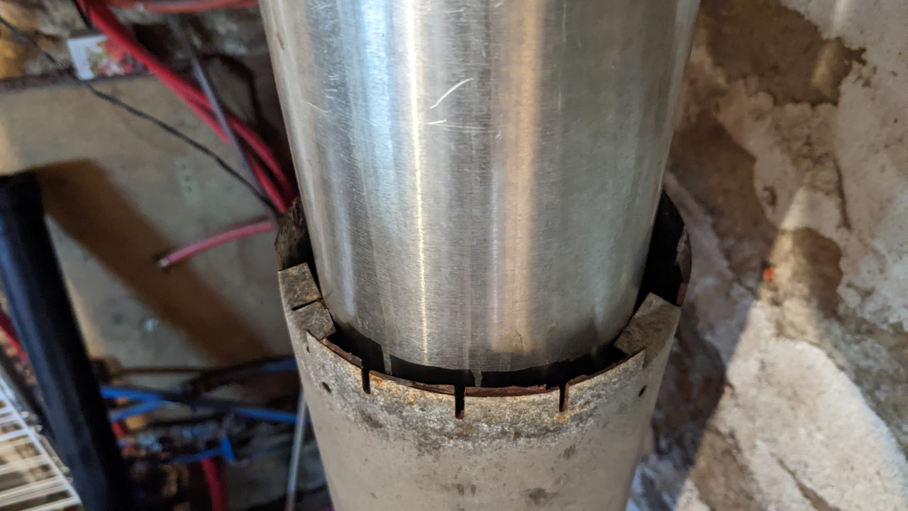 En ajoutant un plus gros morceau de tuyau de cheminée par-dessus le tuyau de cheminée existant et en créant une prise en T, puis en le reliant à l’entrée d’air du poêle à fusée avec un tuyau flexible en aluminium.