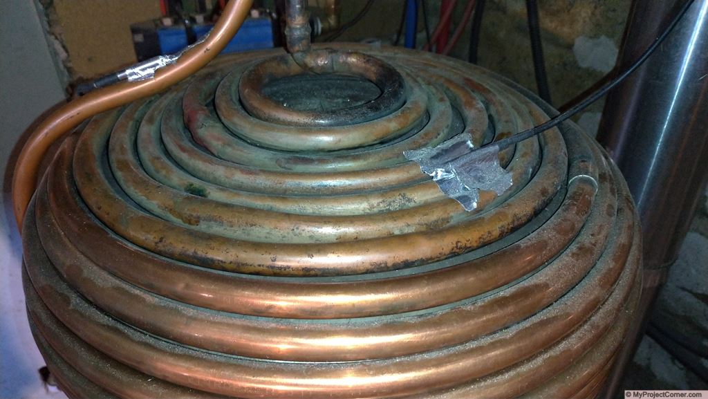 Using three 25 meter coils of 14/16 diameter annealed copper pipe. This was the most expensive part of the whole installation (92€ per coil in 2018). The three coils are soldered together. There is space for one more coil, which I may add in the future. This part of the build was fairly simple as the coils of annealed copper pipe was already practically the same size as the tank that it is wrapped around.